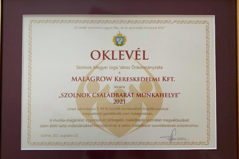 Szolnok önkormányzata második alkalommal írt ki pályázatot abból a célból, hogy elismerje a megyeszékhelyen működő munkáltatók családbarát törekvéseit. Büszkék vagyunk arra, hogy a „Szolnok Családbarát Munkahelye” díszoklevelet idén két másik díjazottal közösen a Malagrow vehette át.