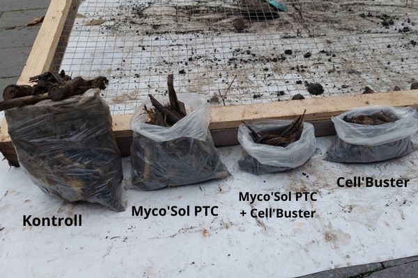 Nem csak a mennyiséget, hanem a megmaradt szármaradványok darabosságát tekintve is igen figyelemre méltó különbséget tapasztalhatunk. Míg a kontrollban és a Myco’Sol PTC-s mintában jól felismerhetők a gyökér- és szárdarabok, addig a Cell’Buster-t tartalmazó két ládában csak rostos, 4-5 cm hosszú szövetdarabokat fedezhetünk csak fel.