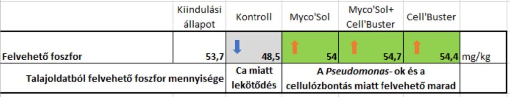 Érdekes a foszfor mennyiségét vizsgálni egy ilyen helyzetben, mivel a talajszkenner a felvehető foszfor mennyiségét mutatja. A talajban nagy mennyiségben jelen lévő kalcium annyira erőteljesen köti le a szabad foszfort, hogy a megfigyelés két hónapja alatt is jelentős csökkenést tapasztaltunk a felvehető foszfor mennyiségében. A talajoltók hatására gyarapszik a szervesanyagban kötött és a Pseudomonas baktériumok által feltárt foszfor mennyiség, még annak ellenére is, hogy maga a talajoltó is egy mésztartalmú vivőanyaggal lett kijuttatva.