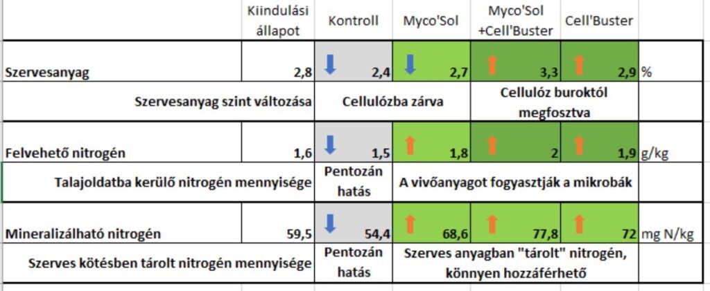 A Myco’Sol PTC és a Cell’Buster készítmények hatása az eredmények ismeretében nem megkérdőjelezhető, ahogy az sem, hogy a talajok legtöbb tulajdonságára hat a szervesanyag jelenléte, illetve a szerves élet tevékenységei.